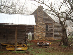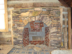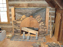 ChimneyThis is a second chimney, the interior part, which will be an arched opening rather than the squared off one as in the first chimney. The next step is to build the interior of the alcove, and install the steel plate that will form the top of the alcove--which will save a lot of time and money. Then I'll be back to building the stone--and hopefully first thing done will be to close off the inside, building up to top of the opening, where the logs start. The second chimney is called the Pluck Chimney, because the building used to be the post office at Pluck, NC, a little cross roads near where I live that no longer exists except in a few memories. Mrs. Vollrath's husband acquired the building, tore it down, moved it, and rebuilt it where it now stands. |